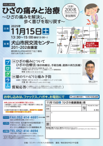 「ひざの痛みと治療~ひざの痛みを解決し、歩く喜びを取り戻す~」と題し、野崎正浩先生、河重俊一郎先生にご講演いただきます。
